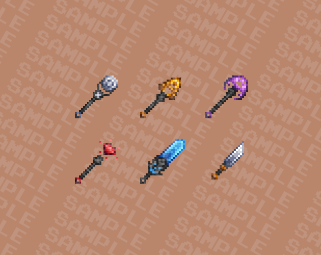 This 24px assets pack contains 50+ weapon icons with unique designe. The pack contains a melee and range weapons that can be used in any your project!